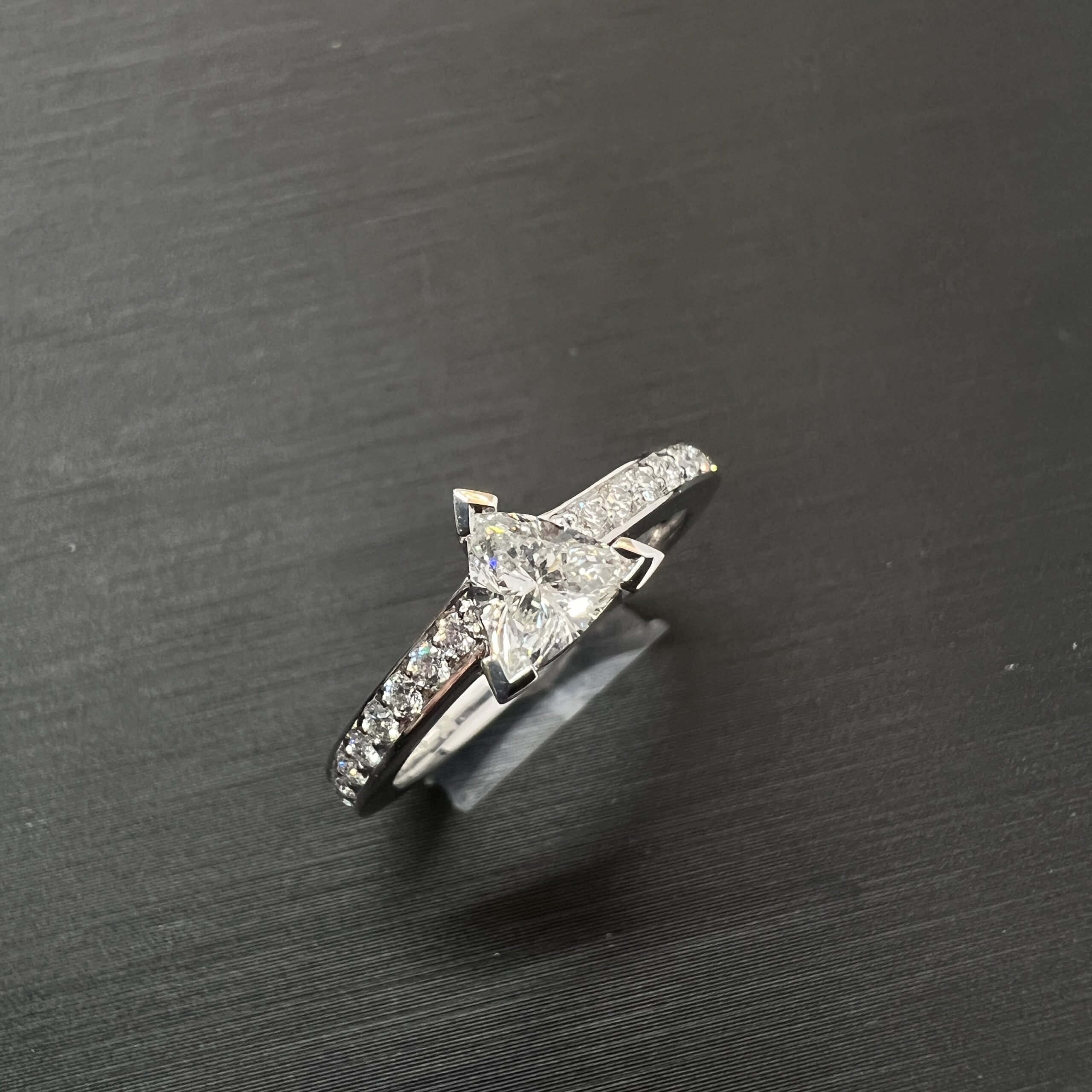 【ダイヤモンド 買取実績】PT900 トリリアントカット リング。希少なカットと脇石の質まで正確に評価し、高松地域最高値で買取いたしました。
